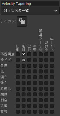 筆圧とフェード(ドラッグ距離)で塗りの不透明度が、筆速で筆先の大きさが変化します。 また、ペンの傾きに応じて筆先が回転します。