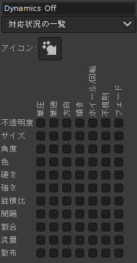 現状、全てのチェックボックスがオフになっています。 つまり、選択中の動的特性 "Dynamics Off" では、全て動的特性が無効になっているということです