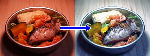 上図のように補正されます。 このように、鮮やかな色合いに調整されます。